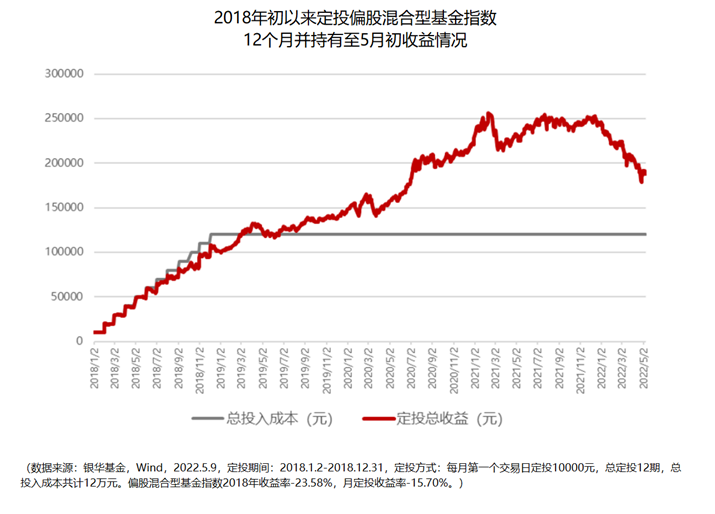 哪怕每次投资的开始恰好不幸遭遇一轮熊市的起点,以偏股混合型基金指数为例,即使在18年的熊市开启定投,每月初定投10000元,坚持定投一年下来,总投入12万元的成本至今年5月初达到了18.76万元,收益率达到56.37%。