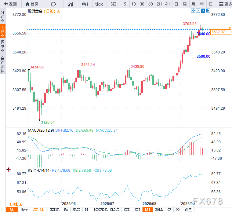 自8月20日启动的这轮上涨一度将金价推至每盎司3702.93美元的历史新高,确认了图表上主导的看涨倾向。
