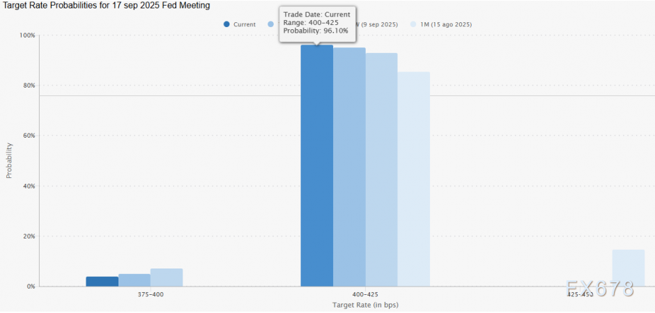 美联储利率决议前夕,所有迹象均指向降息25个基点——利率将从4.5%下调至4.25%。CME数据持续印证这一预期:8月15日降息概率为85.41%,而截至周二已攀升至96.10%,其他结果的可能性微乎其微。