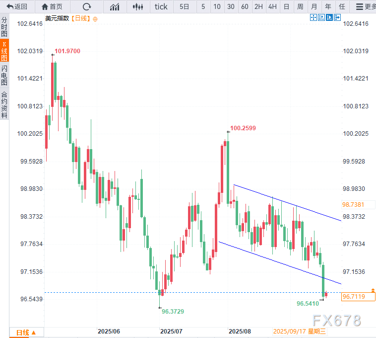 除债券市场外,低利率政策也在冲击美元——近几周美元持续走软。衡量美元对一篮子货币表现的美元指数(DXY)周二已跌破97关口,一度接近7月1日低点(96.54)附近,现报96.74。
