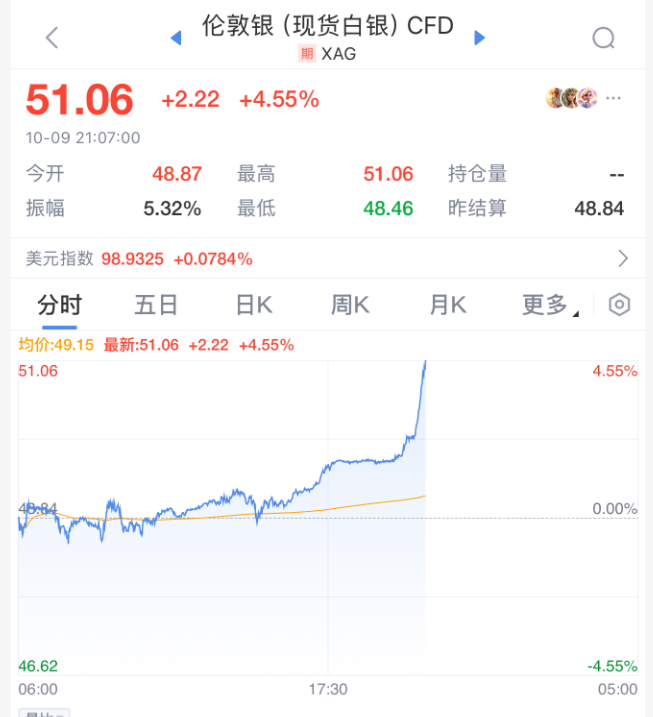 导读 白银首次突破50美元 最近每天都在见证历史。刚刚,白银的价格也创下历史纪录了。 10月9日晚间,受避险需求飙升与伦敦现货市场供应趋紧的双重推动,现货白银价格跃升至数十年来新高。 现货白银日内突破每盎司50美元,创20世纪80年代“亨特兄弟逼仓”以来最高水平。之后呈加速上涨之势,突破50美元整数大关后继续上攻51美元/盎司关口,涨幅扩大至4.5%,报51.06美元/盎司,继续创新高。 今年以来白银涨幅已超过70%,表现胜过创下历史新高的黄金。市场对美国财政风险、股市过热以及美联储独立性遭